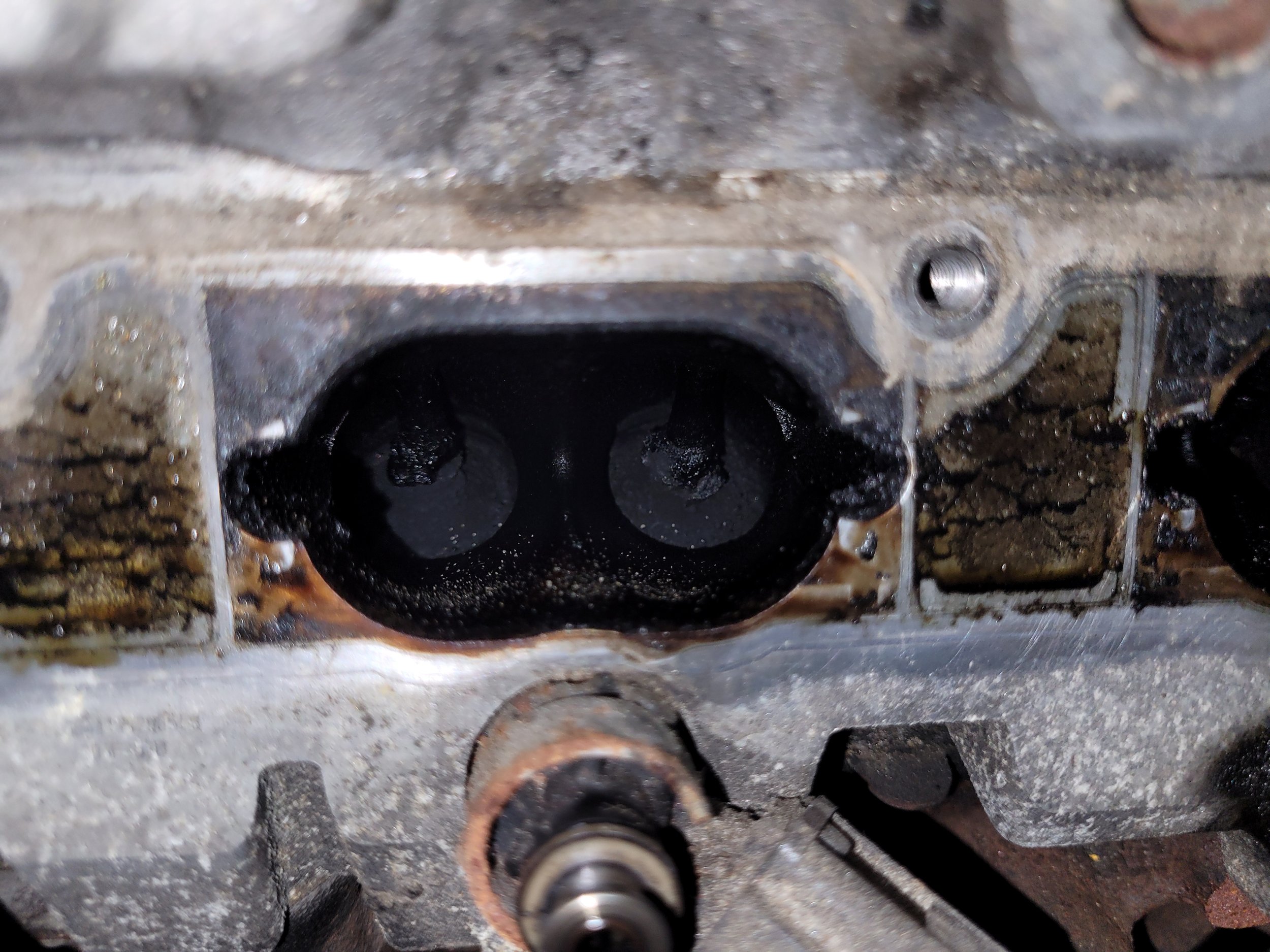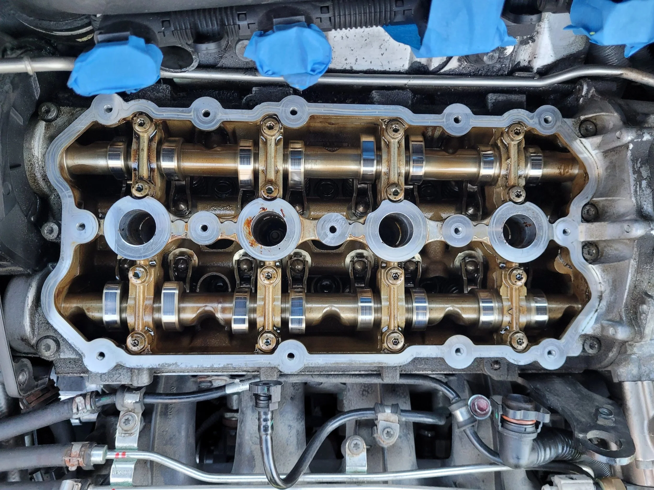 During a routine oil change and spark‑plug replacement, I noticed oil pooled in one of the plug bores. I cleaned the area to avoid flooding the cylinder and removed the plug; the electrode showed no signs of burning oil, which pointed instead to a failing valve‑cover seal. After pulling the cover, I inspected the camshafts and sealing surfaces, documenting everything with photos for my records. Reinstalling the new valve cover required a specific torque sequence, so I marked the order of operations to ensure a precise and consistent installation.