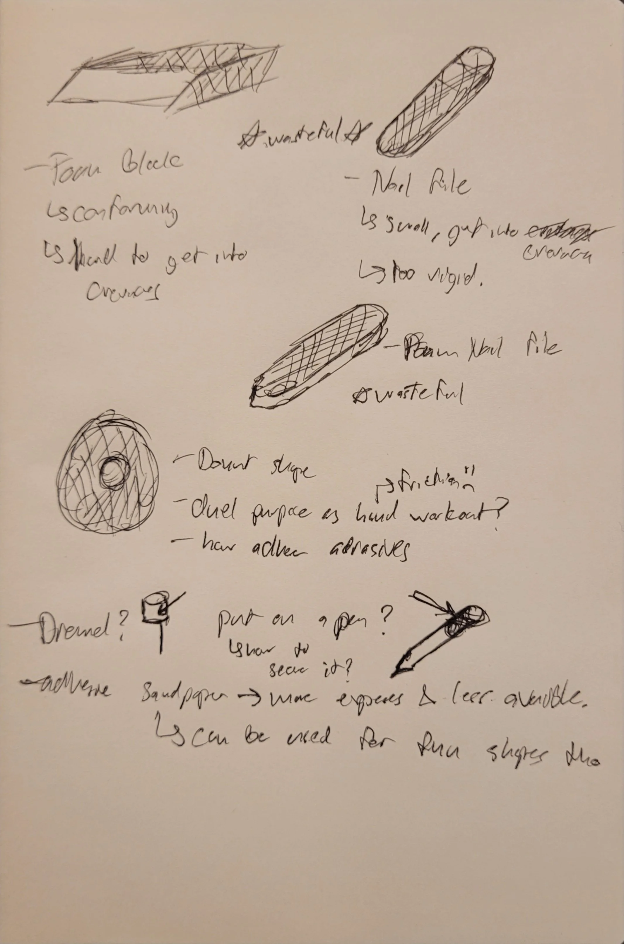 Once I landed on a form factor that offered the right mix of surfaces and edges for tackling the small, intricate contours of the hand, I turned my focus to the mechanism that would securely tension a piece of replaceable sandpaper while keeping the design simple and efficient.